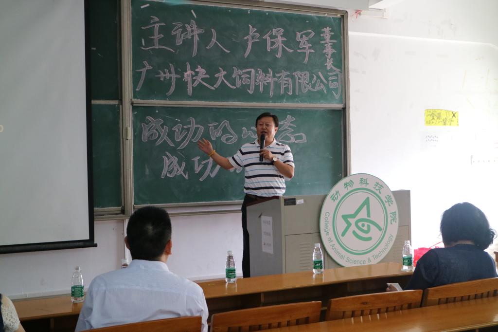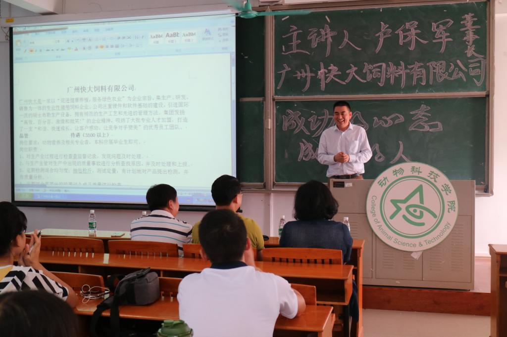 11月17日下午,bevictor伟德官网“职面未来”系列讲座第八场在白云校区杨钊杨勋楼506室顺利举行。广州快大饲料有限公司董事长卢保军为大家作了“成功的心态,成功的人”主题讲座。广东省饲料行业协会副秘书长周洪、公司党总支书记曾献尼等出席本次讲座。