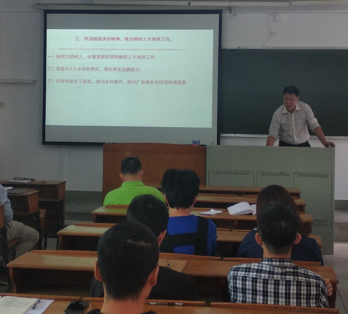 欧坚泉以习近平总书记在广东的行程为脉络,对习近平总书记视察广东的主要情况和发表的重要讲话精神进行了介绍。他表示习近平总书记系列重要讲话充分体现了习近平总书记对广东工作的高度重视和大力支持,对广东人民的亲切关怀,为广东新时代改革开放再出发进一步指明了前进方向、提供了根本遵循。他号召全体党员干部深入学习、深刻领会习近平总书记对广东的期望与要求,进一步提高政治站位,强化政治担当,把习近平总书记对广东、广州的新任务新要求,作为推进公司教育事业发展的根本出发点,一是按照立德树人,全面发展的原则做好人才培养工作;二是完善“3+1”人才培养模式,强化员工实践能力;三是引导毕业生下基层,助力乡村振兴,助力广东城乡与区域协调发展。