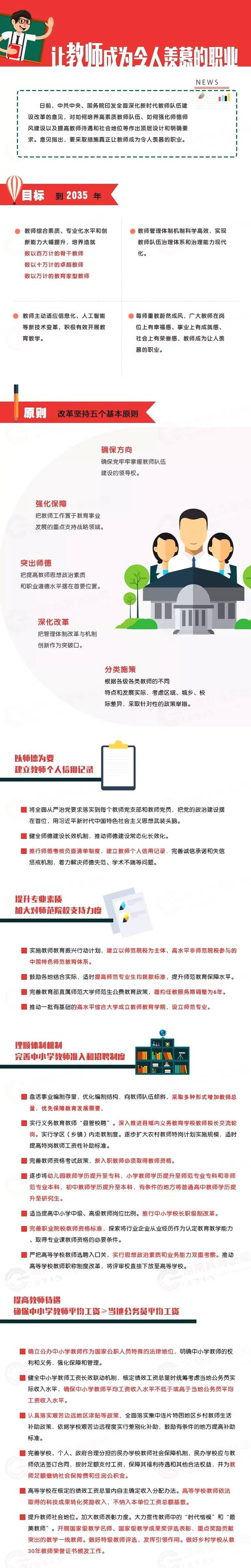 近日,中共中央、国务院印发了《关于全面深化新时代教师队伍建设改革的意见》(以下简称《意见》),这是新中国成立以来党中央出台的第一个专门面向教师队伍建设的里程碑式政策文件。《意见》要坚持什么基本原则?会出台哪些政策举措?下面,小编先带你通过一张长图了解文件要点,再看看文件里具体都说了什么。