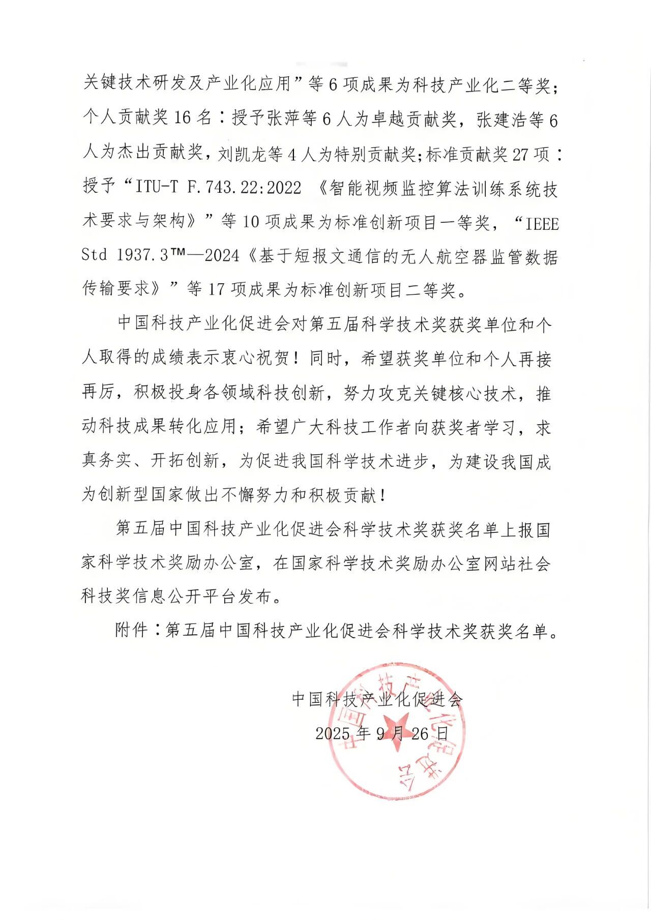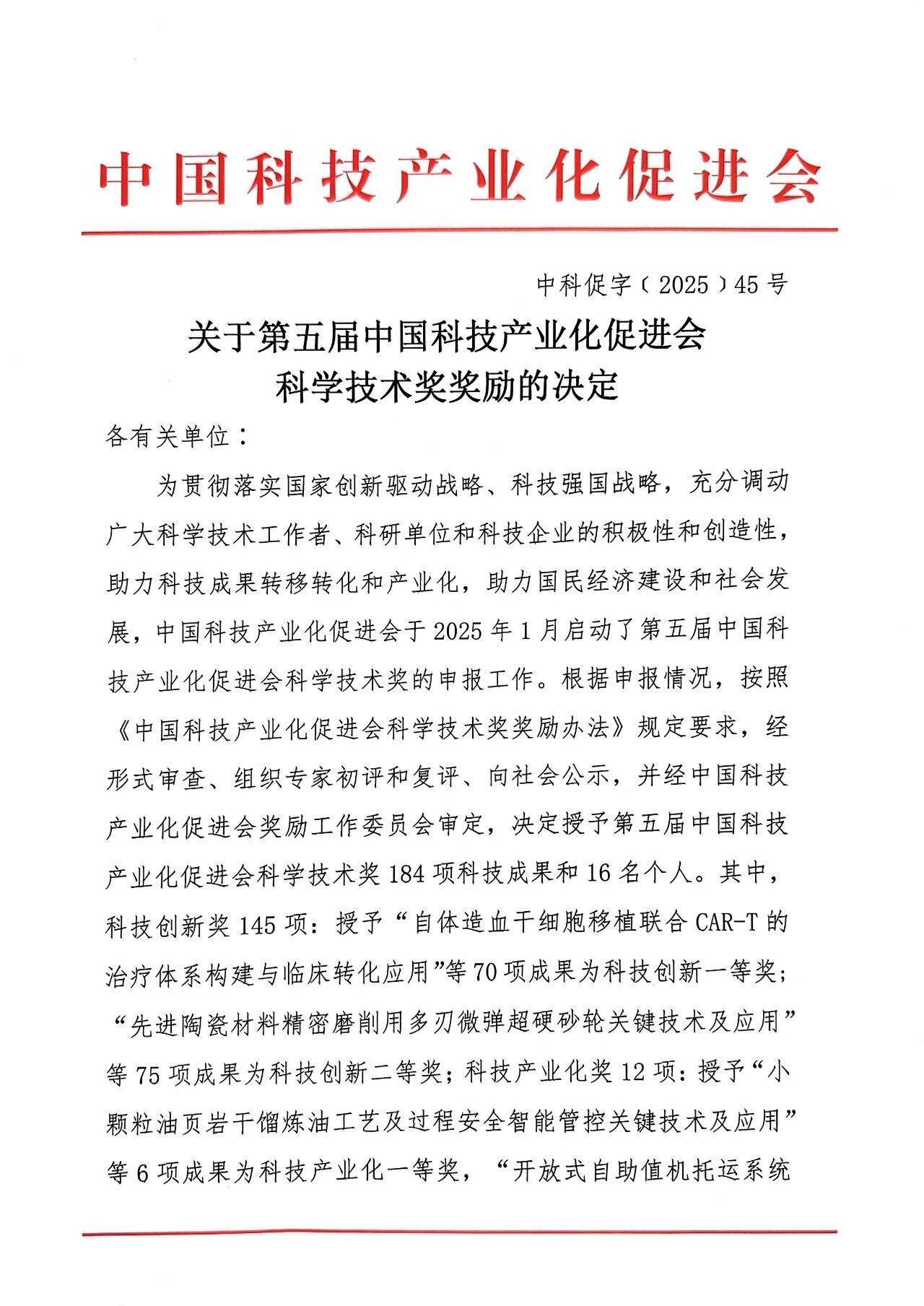 中国科技产业化促进会科学技术奖经国家科技奖励工作办公室备案,重点表彰在科技成果转化和产业化方面作出突出贡献的集体和个人。此次获奖,充分体现了公司科研工作坚持"把论文写在大地上"的鲜明导向。