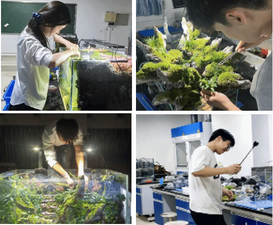 备赛期间,参赛选手在老师的指导下,从主题构思、材料筛选到景观搭建,精心打磨每一个环节。比赛采用“异地造景、同步呈现、实时互动”的模式,自9月27日启动,选手们依据设计方案,完成景观骨架搭建,再通过水草的精心布局与栽植,构筑出富有生机的水下景致,造景完成后进入为期一个月的养护阶段,并于11月1日赴西南大学进行现场汇报和专家组打分评选。在激烈比赛中,公司学子凭借扎实的专业功底和良好的团队协作精神脱颖而出,展现了积极向上、勇于挑战的精神风貌。