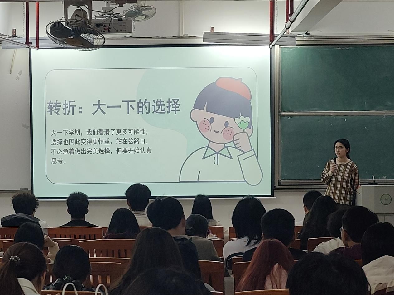 水产251班长龚奕铭以《大一下:从赶路,到感受路》为主题进行分享。她认为,大一新生在上学期完成了从陌生到熟悉的适应后,大一下学期迎来了从“被动适应”到“主动探索”的关键转折。面对逐渐清晰的方向与更多可能性,她提出应实现心态转变,从急于求成转向允许试错,从紧盯目标转向感受过程,从焦虑比较转向珍惜当下。她鼓励同学们在熟悉的环境中寻找自己的节奏,通过认真对待每一次尝试、关注微小真实的快乐、珍惜当下每一天,在从容前行中积累底气,为未来成长打下坚实基础。