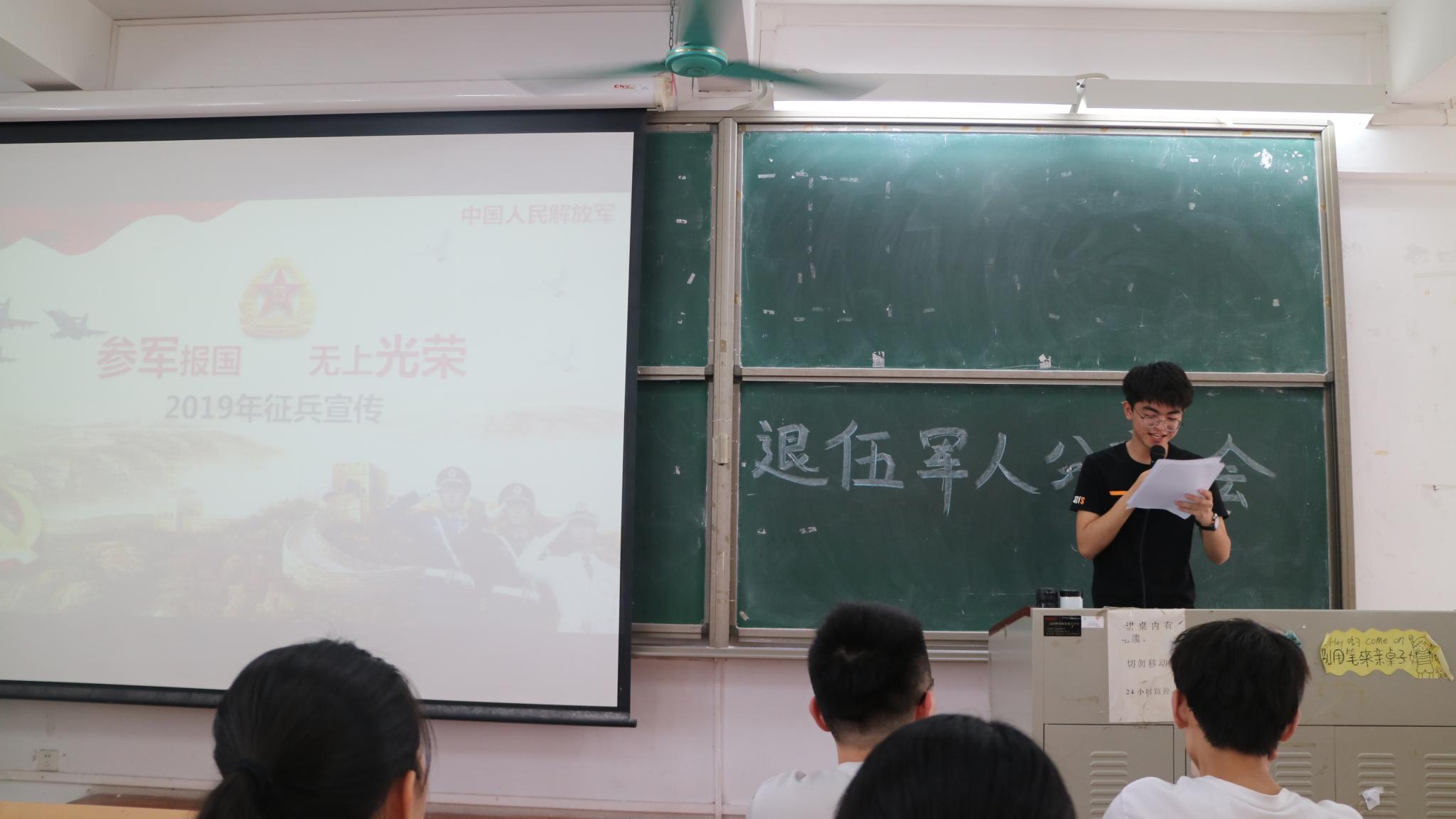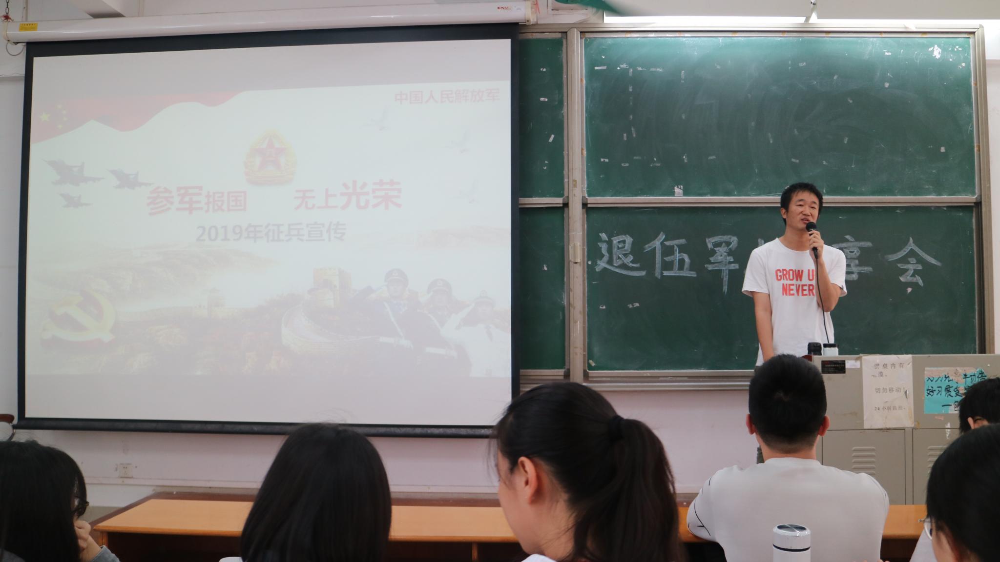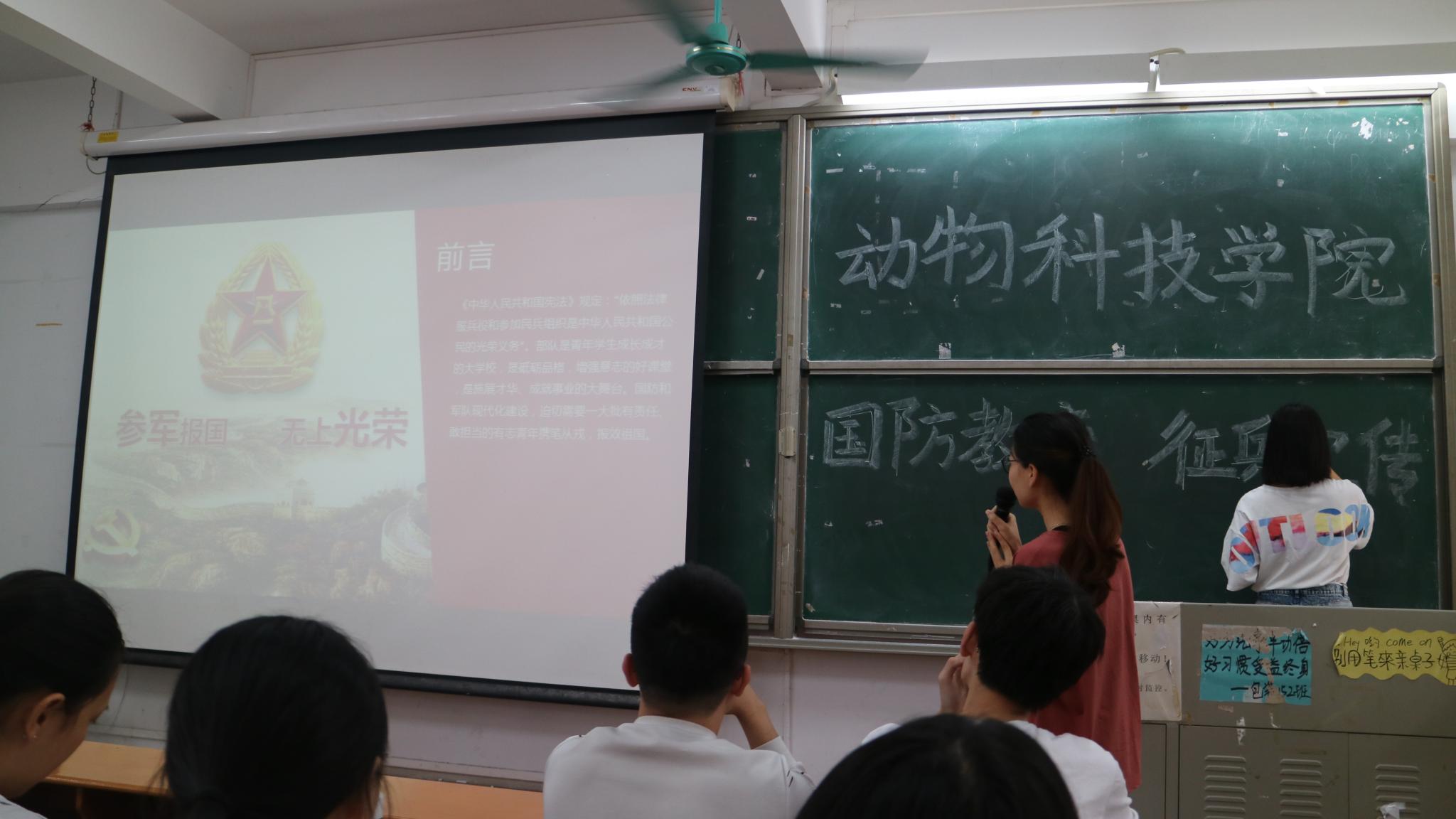 此次国防教育活动分为退位军人分享大会和征兵宣传两个内容。动科172班岑运靖与同学们分享他两年军旅生活的收获。在部队的两年时间里训练里学会了认真与坚持,学会了微笑面对困难,学会了韶华易逝、莫负流年。他表示自己军旅无悔,如果有第二次机会依然会选择报效祖国。