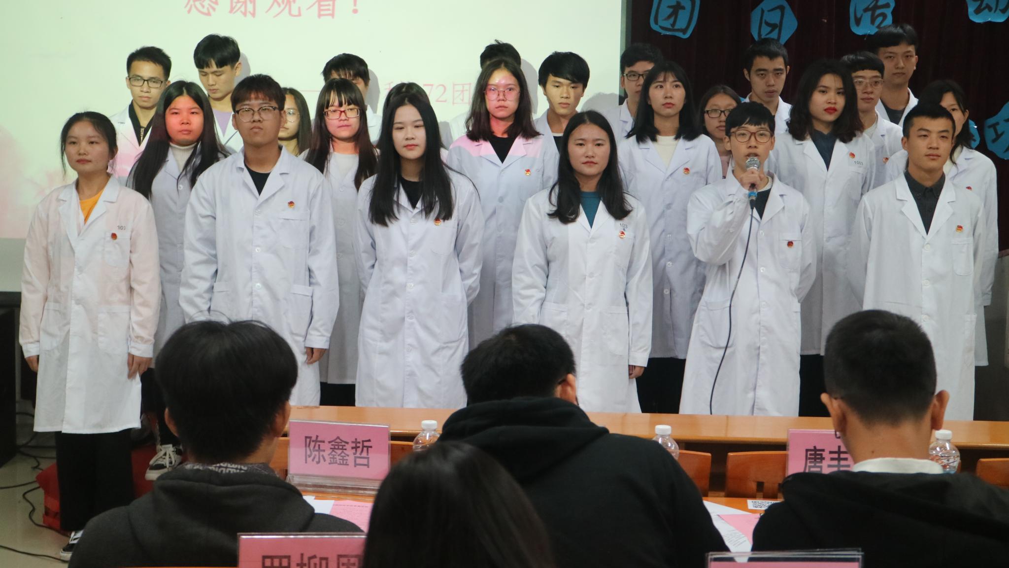 比赛伊始,全体嘉宾和同学们一起唱响团歌。在这种蓬勃进发的氛围中,参赛班级依次喊出了代表班级精神的口号。比赛正式开始后,各个参赛班级进行ppt展示及表演。参赛班级的ppt从各个方面充分的展示了团支部的精神风貌,也突显了同学们在团支部活动中的成长历程。动科172团支部成员们自觉学习十九大精神,在校园内形成学习十九大、争当时代好青年的风尚,表演的改编歌曲《有点甜》从团日精神出发,弘扬团日活动正能量,将现场的气氛推向高潮。