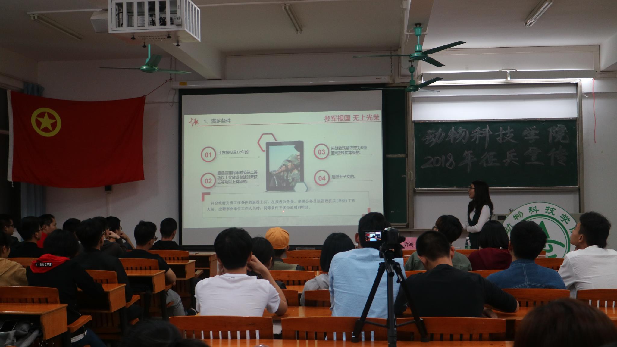 伴随着一支激昂的乐曲,本次征兵活动拉开帷幕。会上,辅导员许鸿老师详细介绍了应征入伍的基本条件、入伍程序、学费资助、安排工作问题。退伍义务兵岑运靖和员工教官陈伟森、张泽智、陈应强分别讲述了他们在军营中的生活经历以及担任员工教官的体验及感想。四名同学在台上绘声绘色的演说令在场员工代表身临其境,对军旅生活充满向往。