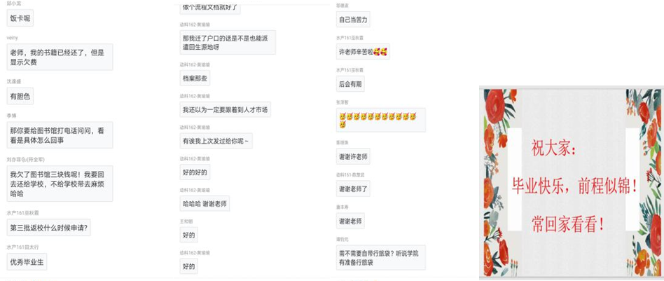接着,许鸿从“费用的缴退手续”“档案材料”“户口迁移手续”等方面向毕业生讲解了离校手续安排,同时从“人身安全”“交通安全”“公共安全”“就业安全”四个方面对同学们进行了毕业安全教育,让毕业生文明、安全、有序离校。