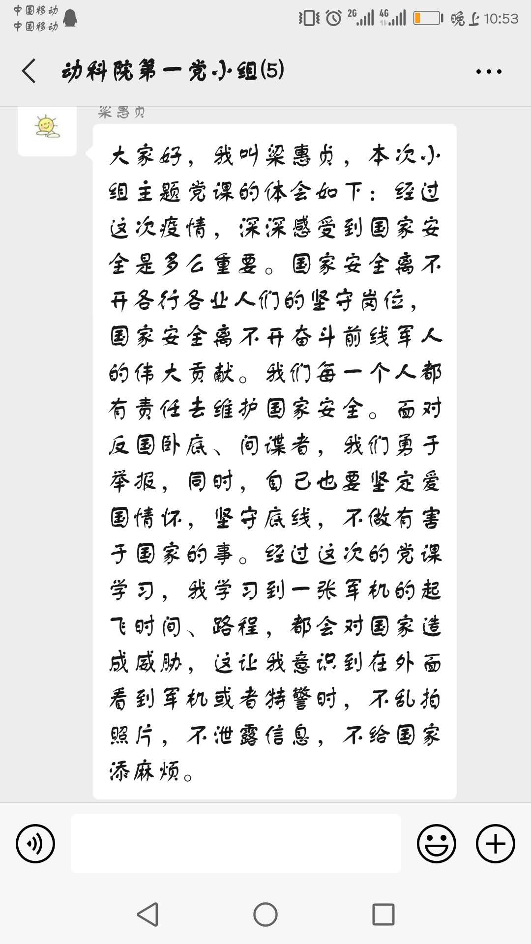 梁惠贞表示:经过这次疫情,深深感受到国家安全是多么重要。国家安全离不开各行各业人们的坚守岗位,国家安全离不开奋斗前线军人的伟大贡献。我们每一个人都有责任去维护国家安全。面对反国卧底、间谍者,我们勇于举报,同时,自己也要坚定爱国情怀,坚守底线,不做有害于国家的事。经过这次的党课学习,我学习到一张军机的起飞时间、路程,都会对国家造成威胁,这让我意识到在外面看到军机或者特警时,不乱拍照片,不泄露信息,不给国家添麻烦。