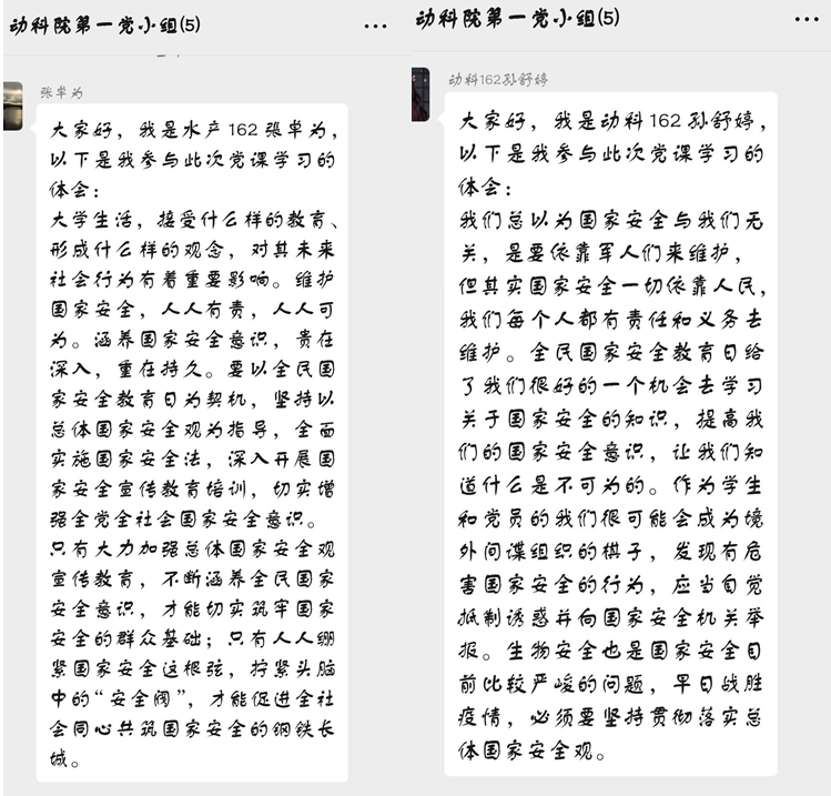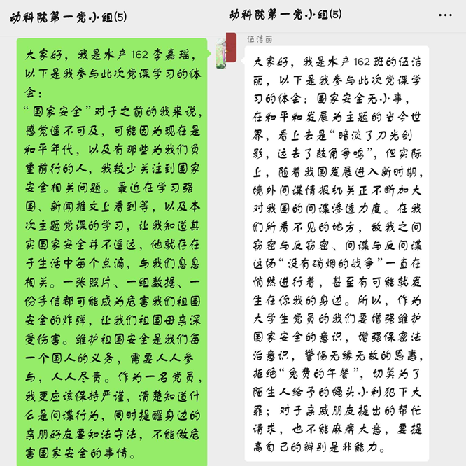 李嘉瑶表示:“国家安全”对于之前的我来说,感觉遥不可及,可能因为现在是和平年代,以及有那些为我们负重前行的人,我较少关注到国家安全相关问题。最近在学习强国、新闻推文上看到等,以及本次主题党课的学习,让我知道其实国家安全并不遥远,他就存在于生活中每个点滴,与我们息息相关。一张照片、一组数据、一份手信都可能成为危害我们祖国安全的炸弹,让我们祖国母亲深受伤害。维护祖国安全是我们每一个国人的义务,需要人人参与,人人尽责。作为一名党员,我更应该保持严谨,清楚知道什么是间谍行为,同时提醒身边的亲朋好友要知法守法,不能做危害国家安全的事情。