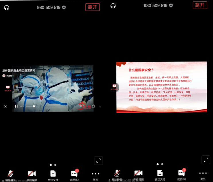 会议上,党小组成员孙舒婷围绕4月15日全民国家安全教育日相关知识进行讲解。首先,以观看“总体国家安全观公益宣传片”微视频为引入,详细讲解“国家安全”、“ 全民国家安全教育日”、 “总体国家安全观”等概念的含义,接着介绍关于国家安全的一些法律法规,并列举相关案例,最后讲解间谍行为以及当发现失密、泄密和窃密等情况下作为当代老员工应如何应对。