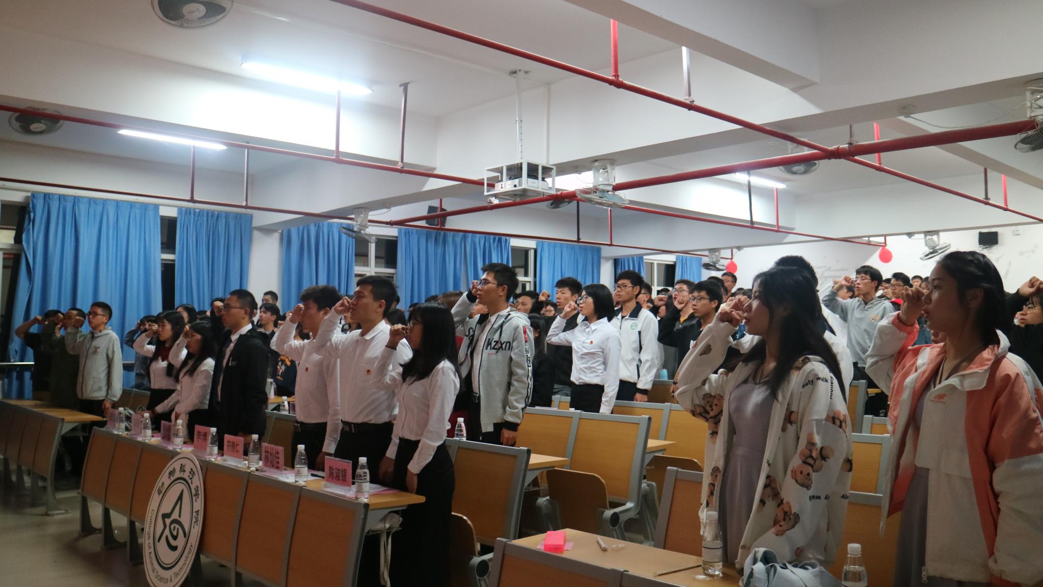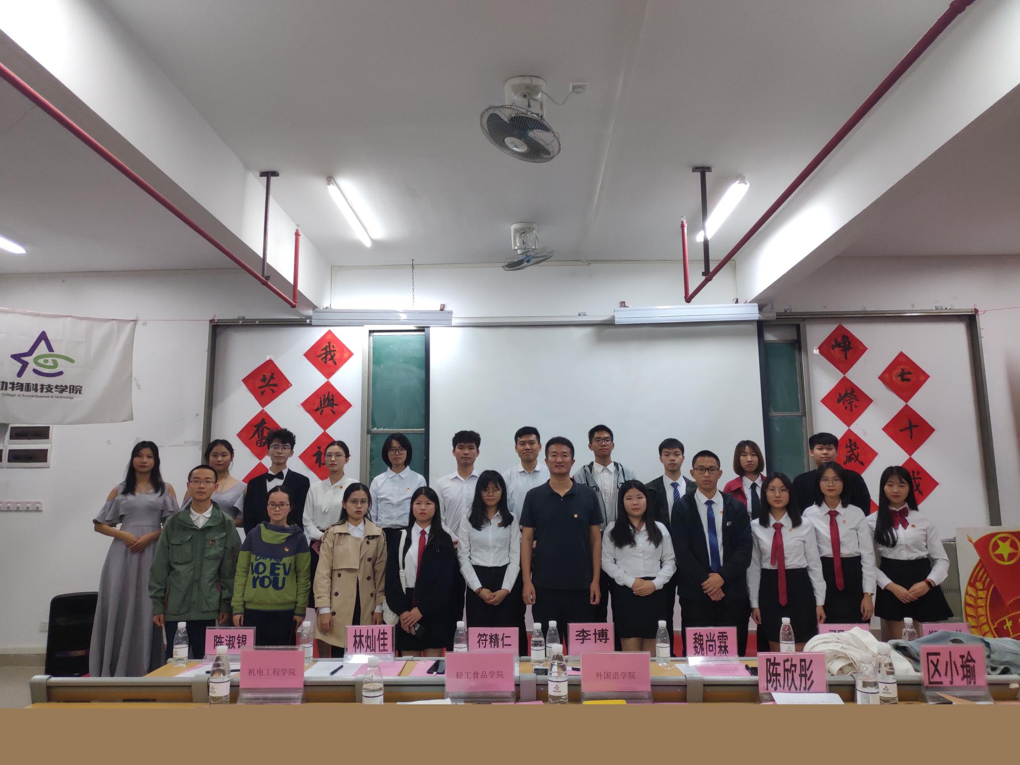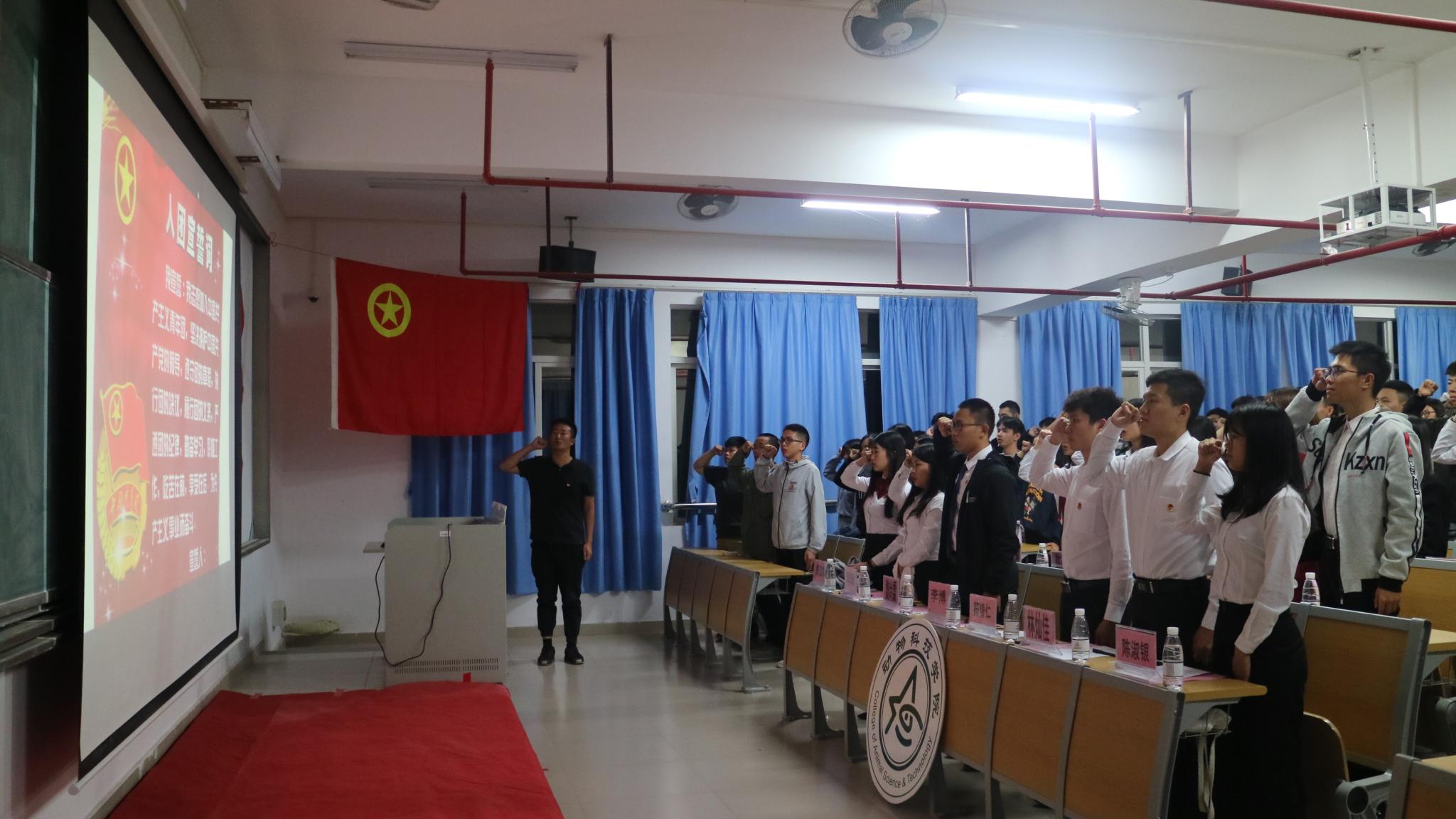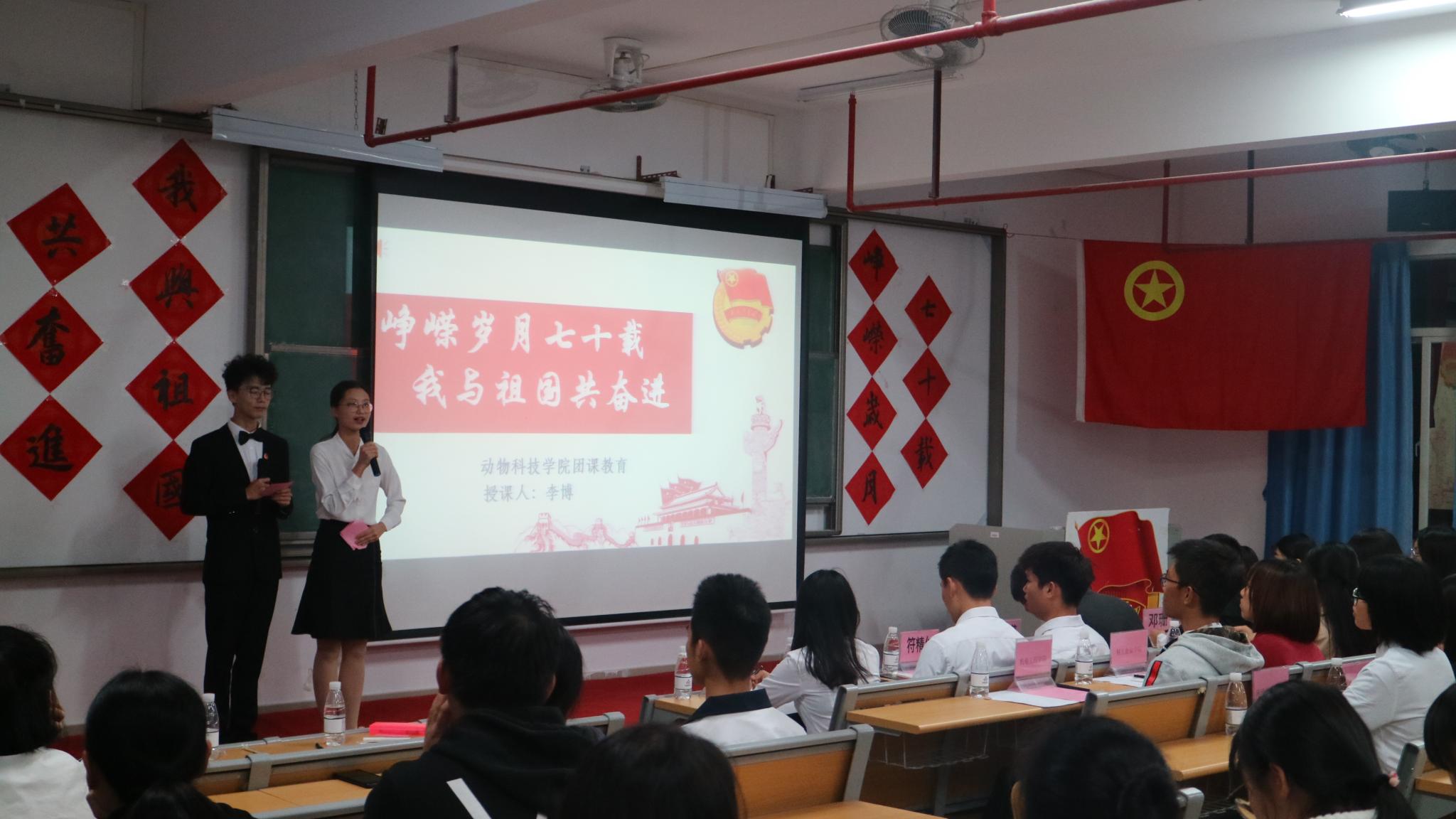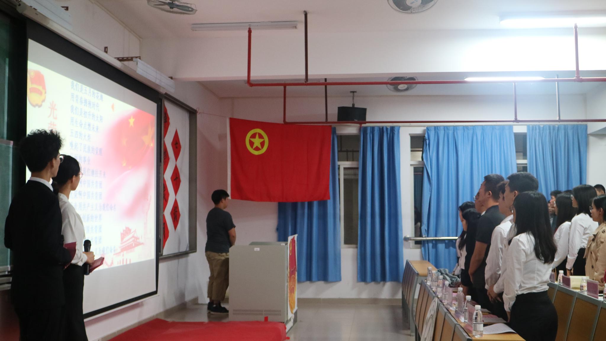 晚上七时,bevictor伟德官网“峥嵘岁月七十载,我与祖国共奋进”团课活动正式开始,全体师生起立面向团旗,奏唱团歌。
