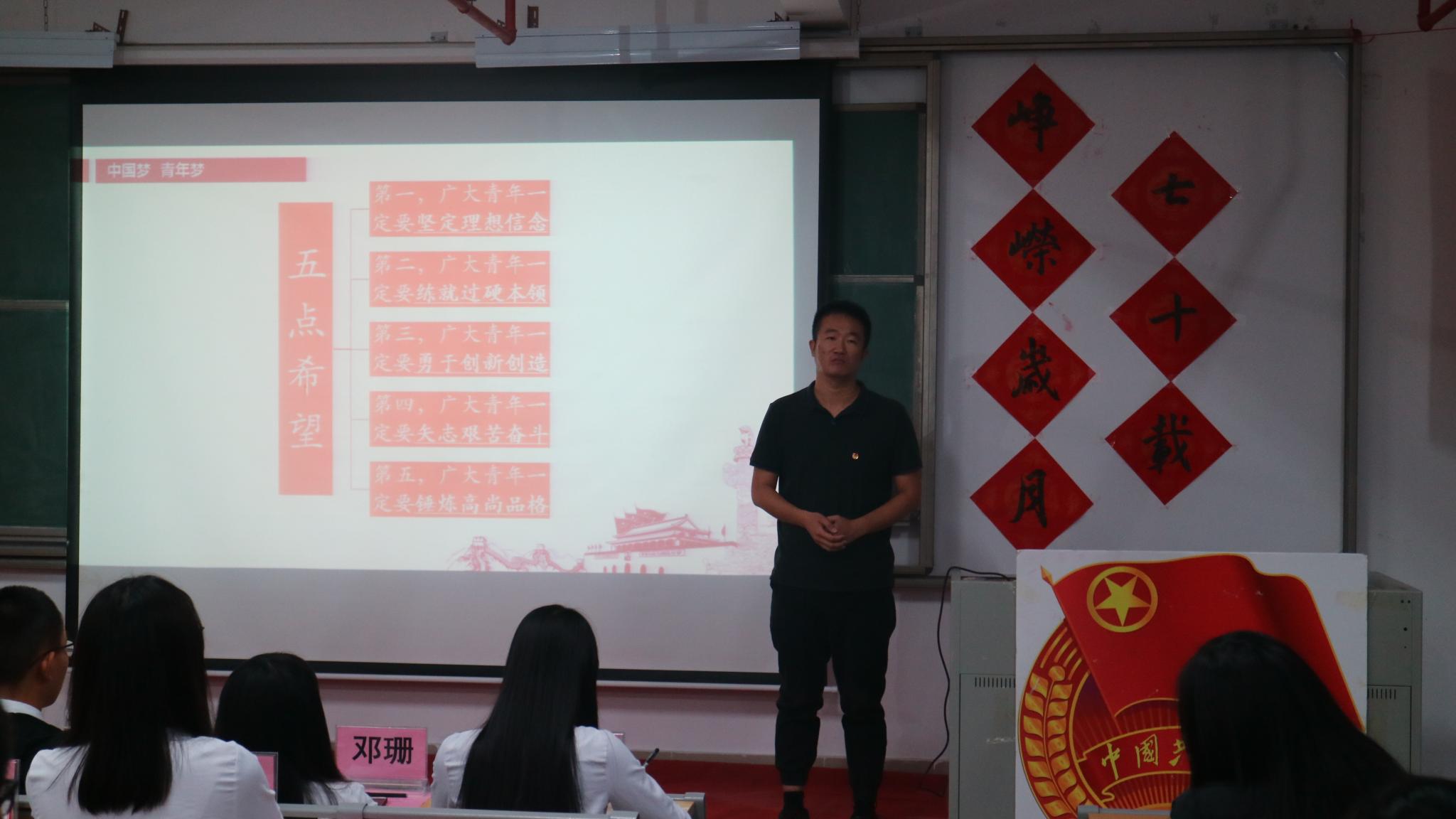 本次团课的主讲人为院团委副书记李博。在团课上,李博向同学们介绍了新中国成立七十周年的沧桑巨变,从老百姓的衣食住行,从祖国科技实力的发展让同学们体会到了祖国的峥嵘岁月离不开一代代青年人的奋斗建设。同时还向大家介绍了才女武亦姝,女排健将朱婷等新时代的青年典范,希望同学们以这些优秀青年为榜样,努力奋斗。接着,李老师以习近平总书记对青年的寄语勉励同学们认真学习,将来积极为祖国奉献。他还鼓励同学们:“希望我们公司的员工无论走到哪里,都是那最优秀的人,都会被人家竖起大拇指说‘真棒’!”团课最后,李老师和全体同学共同举起右拳回顾了当初入团时的宣誓词。