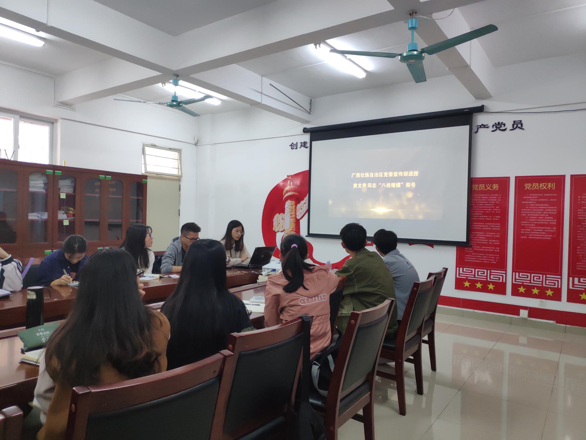 接着,通过视频学习了黄文秀同志的先进事迹。由党员郑少玲对黄文秀同志的先进事迹进行微党课展示。黄文秀同志的先进事迹,观看视频过程中,不少党员都被黄文秀同志的精神所感动,流下了感动的泪水。习近平总书记强调说:黄文秀同志研究生毕业后,放弃大城市的工作机会,毅然回到家乡,在脱贫攻坚第一线倾情投入、奉献自我,用美好青春诠释了共产党人的初心使命,谱写了新时代的青春之歌。广大党员干部和青年同志要以黄文秀同志为榜样,不忘初心、牢记使命,勇于担当、甘于奉献,在新时代的长征路上做出新的更大贡献。