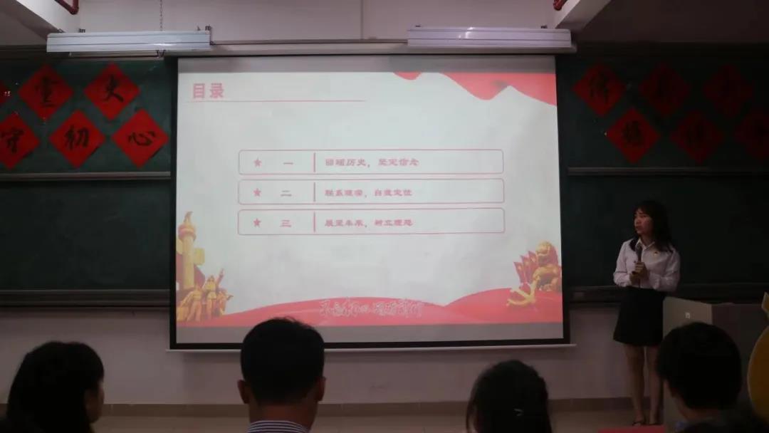 活动的中场,由团委的全体成员激情澎湃的朗诵了《西江月·井冈山》和《浪淘沙·北戴河》红色诗词。随后,张秋爽通过回归顾历史,坚定信念、联系现实,实现自我定位和展望未来,梳理理想这三个方面来分享在党史学习中的心得。