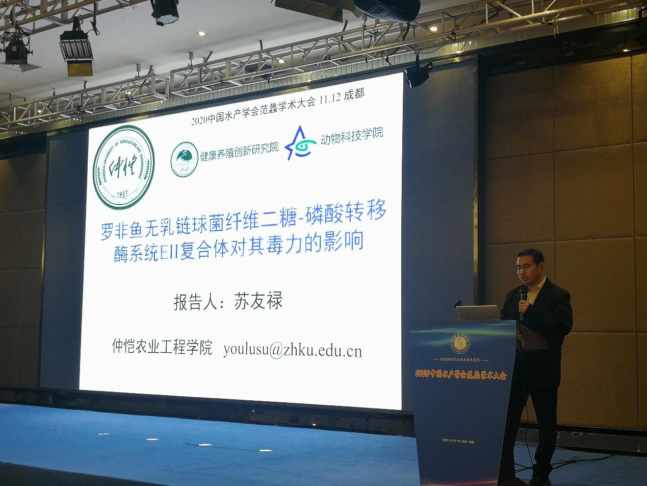 11月10-13日,bevictor伟德官网/健康养殖创新研究院水产病害防治团队在苏友禄副教授带队下一行5人参加了在成都召开的2020中国水产学会范蠡学术大会,团队苏友禄副教授提交的《罗非鱼无乳链球菌纤维二糖-磷酸转移酶系统EII酶复合体对其毒力的影响》和江飚博士提交的《一种防控刺激隐核虫病杀虫涂料研发》入选会议口头报告,刘春博士提交的《鱼类类结节病病原舒伯特气单胞菌的致病机制研究》入选会议墙报,代表公司和研究院与全国同行交流了工作进展。