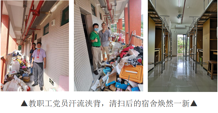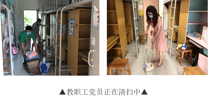 按疫情防控要求,6月底毕业生分批离校,而7月初2018级女生宿舍搬迁行动迫在眉睫。一环扣一环的工作,时间紧、任务重、要求高、责任大。经提前入室检查,宿舍区还积攒了大量的废弃物品来不及清扫,物业服务人员已经忙得不可开交,应接不暇。为了保证员工能顺利地进驻新宿舍,7月1日,教工党员志愿队先头部队在党总支书记欧坚泉的带领下,来到白云校区,对即将迁入的宿舍进行清理打扫,以实际行动践行初心担当使命,开展了一次特殊主题的党日活动,向党的生日献礼。