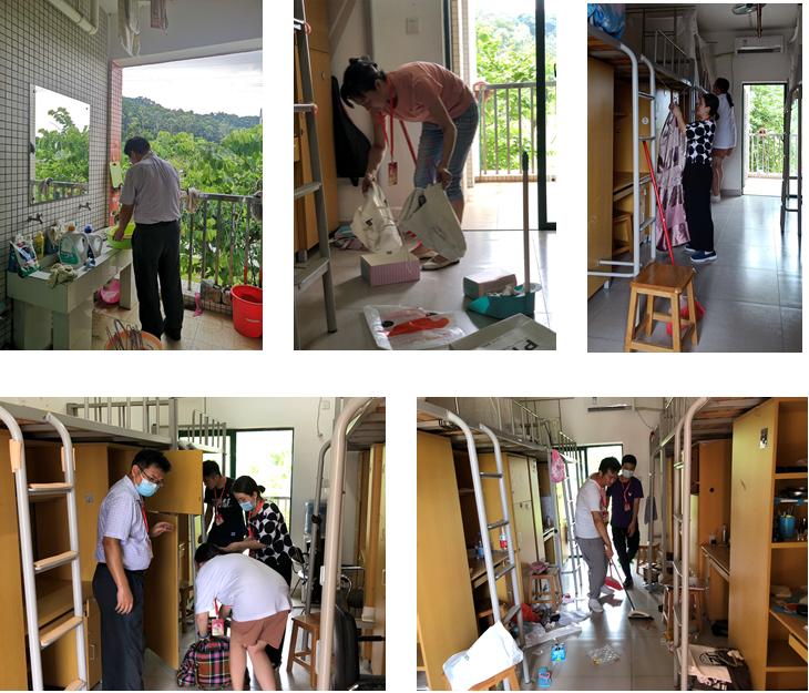 正午骄阳时,在党总支书记欧坚泉、副书记朱路平的带领下,10名教工党员志愿者和2名员工志愿者来到18栋宿舍区。志愿队员们分配好任务,克服困难,团结协作,发扬不怕脏不怕累的精神,积极投入清扫工作。坚持不落下任何一间宿舍,不留下任何一个死角。汗水挂满额头,湿透了衣背,忙碌的身影筑成一道道亮丽风景线,定格在这个特殊的日子里。经过了两个多个小时不停歇的辛勤劳动,大家终于完成了全面清扫新宿舍的志愿活动。打扫后的宿舍一改当初的杂乱景象,变得整洁明亮了。教工党员在关键时期体现了众志成城的大局意识、挺身而出的责任意识和担当作为的奉献精神,以实际行动弘扬优良传统和踏实作风,将党员能量和爱的温度传递给员工。