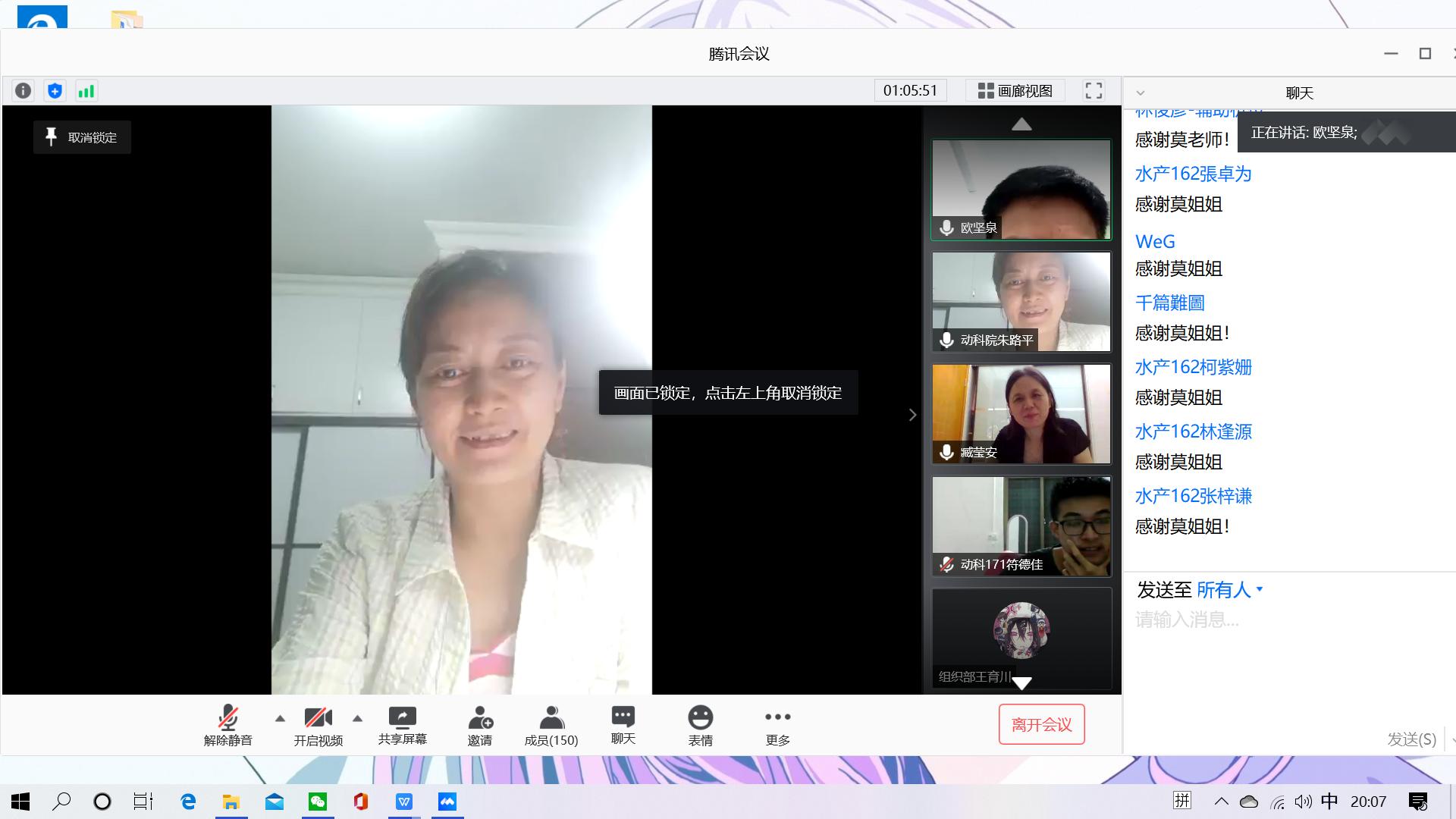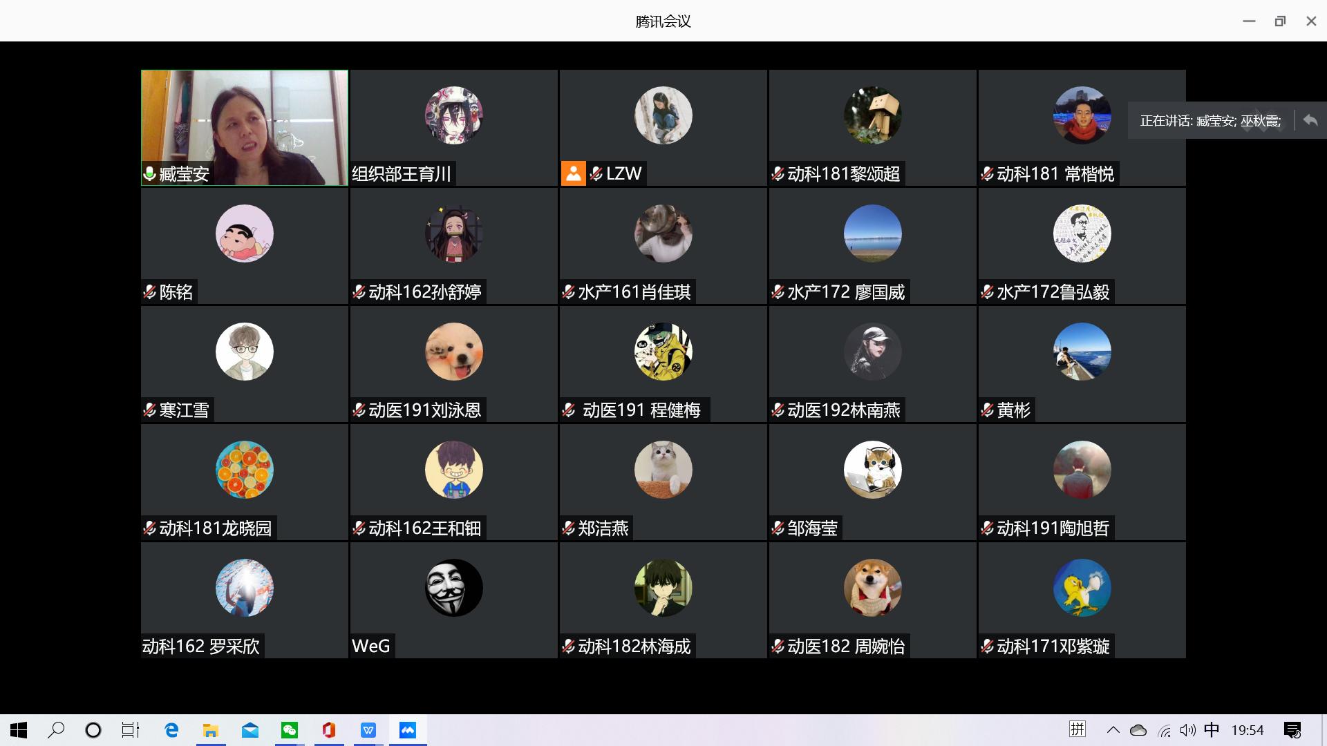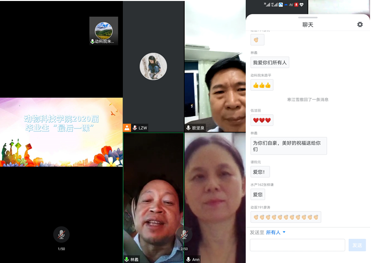 一段精心制作的视频掀开了活动的序幕,师生们一起回顾了大学四年来的点点滴滴。“最后一课”上,经理林蠡寄语毕业生们,生活因疫情搬上云端,云课堂、云就业、云面试、云签约孕育而生,希望同学们能够坚定信心,持拥抱时代变化的态度和勇气,踏着新时代的步伐走向未来。两位毕业班班主任深情回顾了与同学们相处的点滴故事,向同学们表达了最美好的祝福。毕业生代表区海欣向全体师生表示衷心的祝愿,表达对大学时光的留恋和对老师们悉心培养的感激之情,表态会继续努力,填好人生的履历为母校争辉添彩。在校生代表动科172班骆思园祝愿师兄师姐在今后的岗位上谱写人生辉煌的篇章,扬帆起航,一路欢歌。