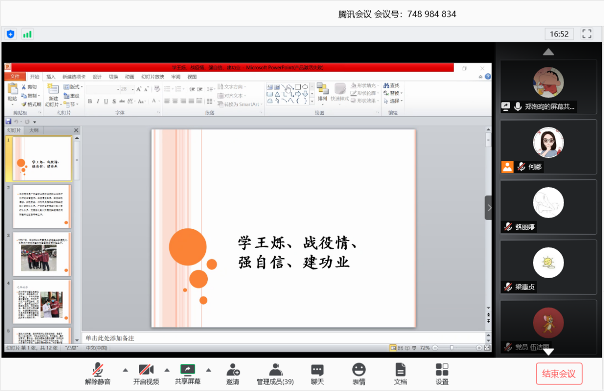 随后,党员代表梁惠贞,张穗玲,邱小龙等同志发表学习感想。王烁同志作为一名共产党员,起到了先锋模范作用。在疫情期间,他义无反顾地冲往一线,虽然因公殉职,但是他永远活在我们的心中。他用青春和生命践行着入党誓词,做为员工党员的我们,应该将王烁同志的精神传承下去。在疫情期间,我们也应该把时间和精力花在有意义的事情上,做好员工本分,努力学习真本事更好地为大家服务。
