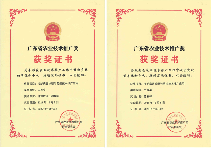海鲈病害的诊断及防控技术措施推广应用面积达到6000多亩,辐射整个产业园区30000多亩,养殖用药量减少12%,三年来推广应用企业及合作社累计新增产值2857万元,新增利润711万元,成效显著。研究团队在国内首次针对海鲈开展了系统的病害监测和防控体系,率先建立了珠海市海鲈病原库1个,对分析和研究海鲈病原具有重要价值,并依此开展重要病原的药敏分析和疫苗研发,推动海鲈病害防控向更高水平发展。该研究成果于2021年获得了广东省农业技术推广奖二等奖。
