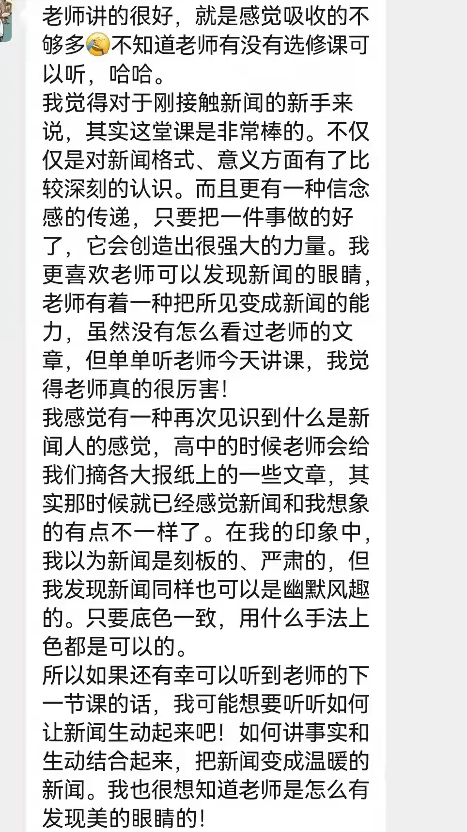 此次新闻采写培训深入浅出,不仅调动了同学们关注身边事的积极性,还提高了同学们挖掘新闻亮点的能力,让同学们受益匪浅。