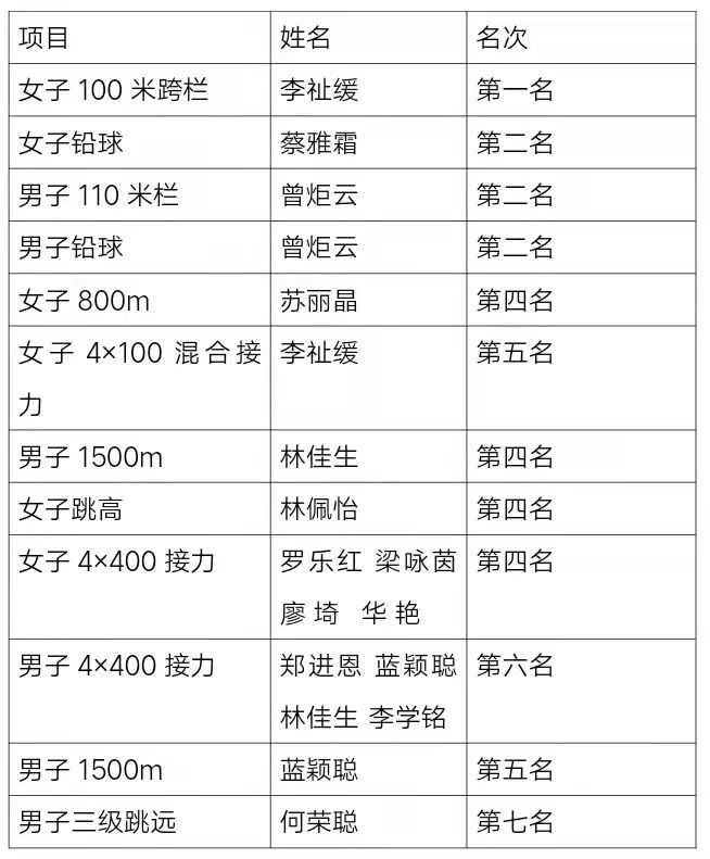 bevictor伟德官网今日赛程有男子铅球决赛、女子铅球决赛、男子跳远决赛、女子跳远决赛、男子100米预赛、女子100米预赛、男子110米栏决赛、女子100米栏决赛、男子400米决赛、女子400米决赛等。田径场上的运动员踏着矫健的步伐跑向胜利的终点,席上的观众高呼“加油”。他们的目光紧紧跟随着参赛选手,他们的神情随比赛结果而变换,他们的表现与运动员紧密相关。在热情的加油声中,bevictor伟德官网参赛选手取得了优秀的成绩。以下是bevictor伟德官网参赛选手具体获奖情况: