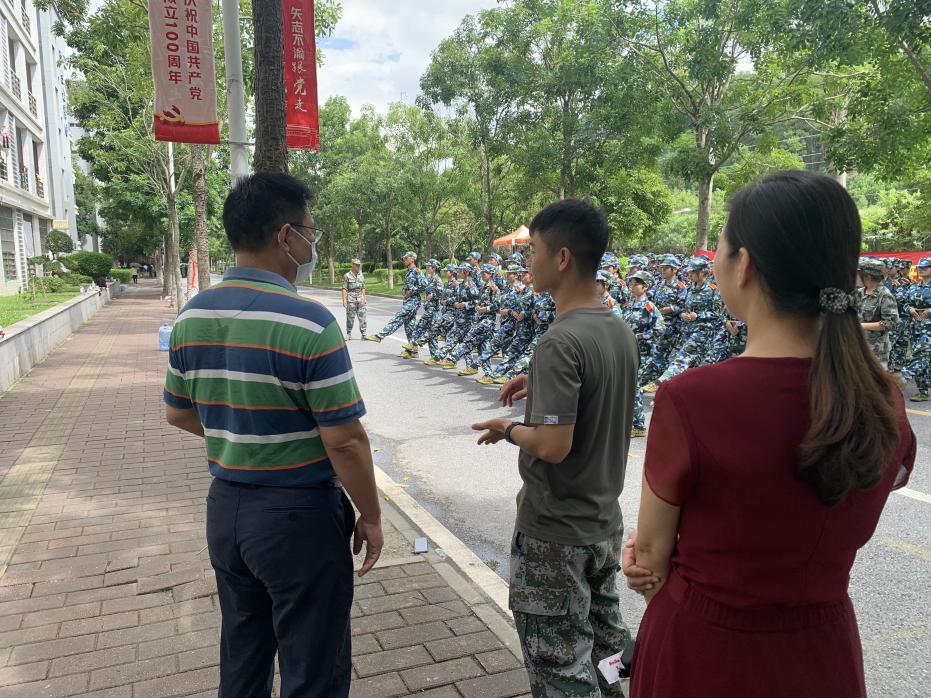 天高云淡,秋风习习,9月24日上午,公司党委书记欧坚泉、党委副书记朱路平、辅导员赵江视察指导了bevictor伟德官网2021级本科生军训工作。