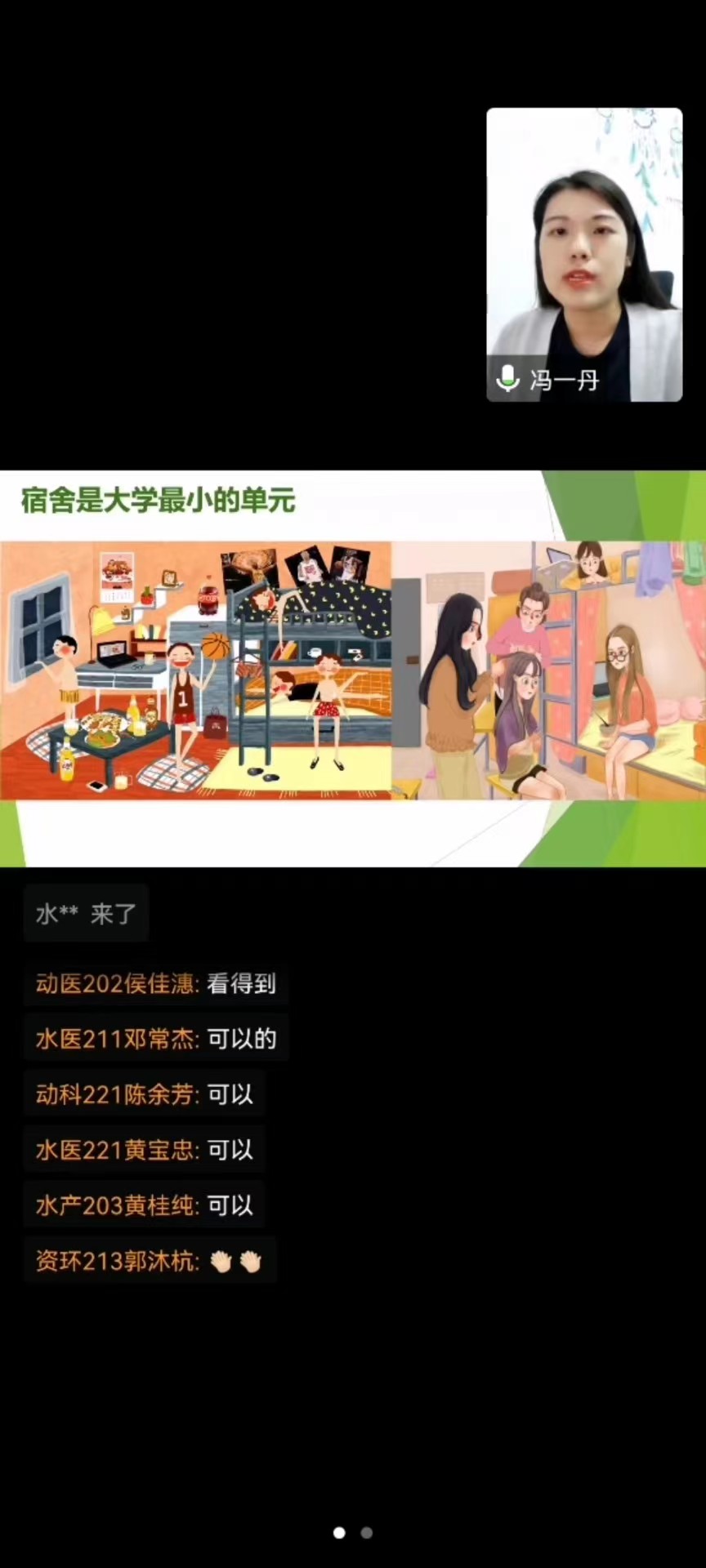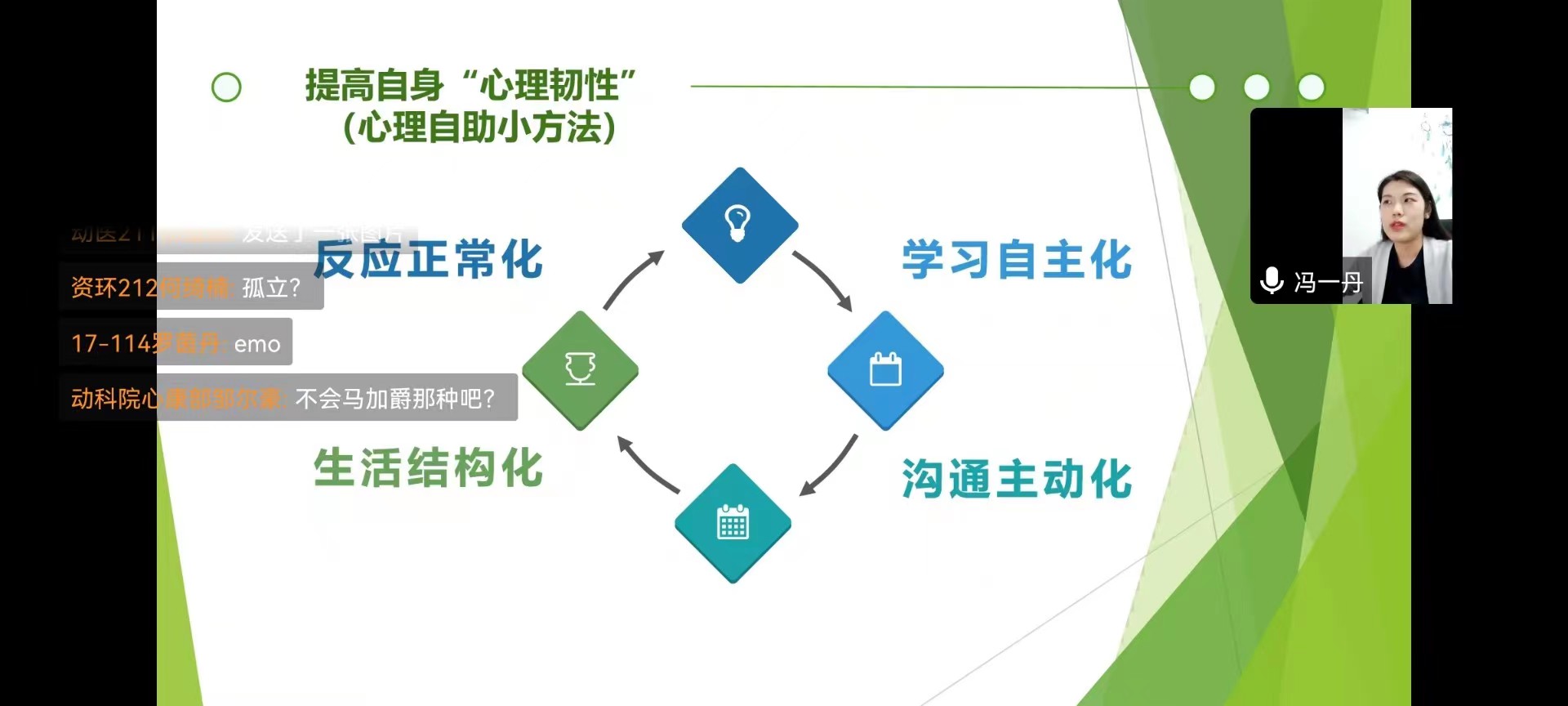 本次会议围绕新形势下老员工的心理特征、疫情反复下老员工的心理特征、宿舍心康员如何发现问题和宿舍心康员的“助人与自助”四个方面展开。首先,冯一丹指出,宿舍心康员同时具有心理知心人、宿舍守护者和危机汇报员这三个角色的特点,并分享了做好这三个角色的具体方法。接着,她向宿舍心康员们普及了大多数在校老员工心理问题的来源,以及在疫情反复中老员工可能遇到的困难和心理失衡的表现,并从精神、认知、情绪三方面给宿舍心康员们支招,教导大家及时发现并反映舍友的异常行为。然后,在bevictor伟德官网四位同学的配合下,冯一丹利用“一人一故事剧场应用戏剧”的方式,让大家感受到日常冲突是怎么发生的,引出朋辈心理辅导基本理念:尊重、温暖、真诚、共情、积极关注。最后,冯一丹分享了四个心理自助小方法:反应正常化、生活结构化、沟通主动化和学习自主化,强调帮助他人前先学会自助,宿舍心康员们要提高自身“心理韧性”,坚持主动关怀、精准研制、寻找资源、积极转介。
