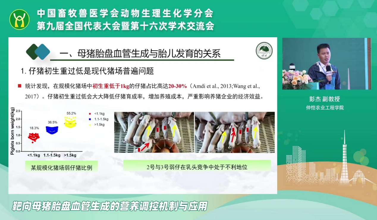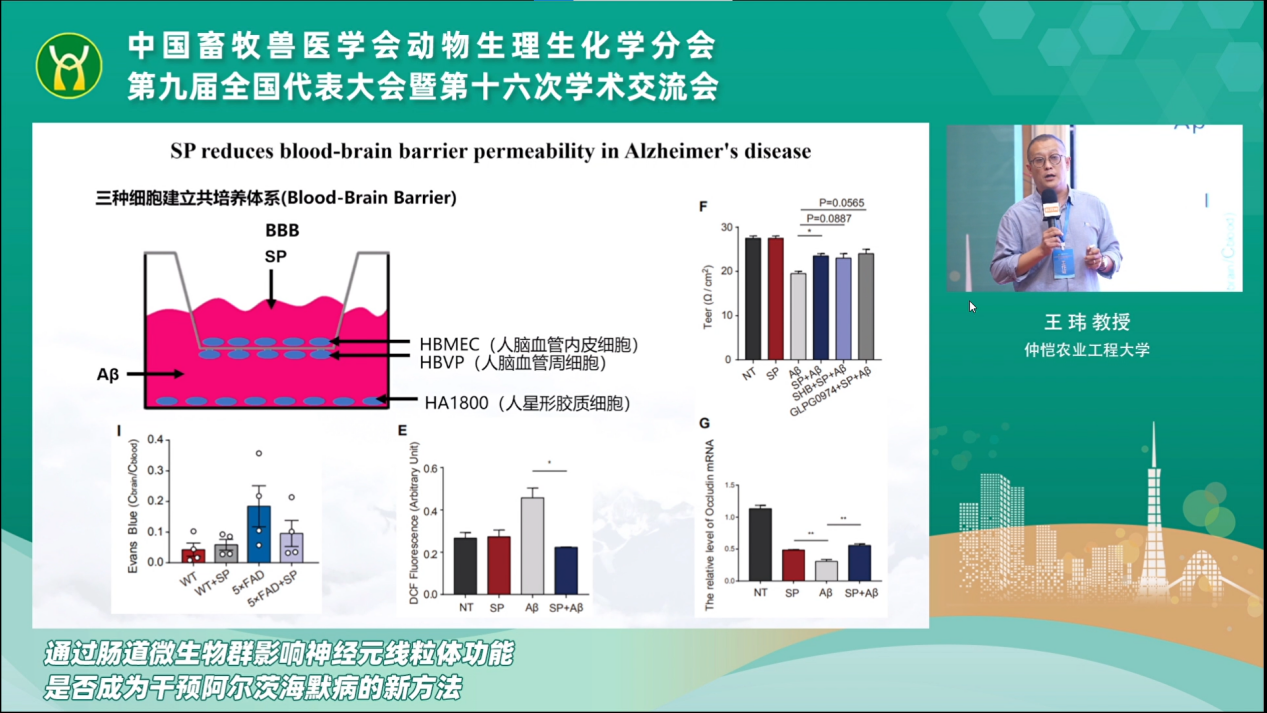 本次大会共有29位国内同行专家围绕动物采食调控、肠道健康、营养免疫调控、动物克隆等领域进行学术交流。公司动物生理学科王玮教授、彭杰副教授、周烁副教授3人受邀做了大会报告。王玮教授以《通过肠道微生物群影响神经元线粒体功能,是否成为干预阿尔茨海默病的新方法》为题,介绍了课题组在阿尔茨海默症发病机理和调控策略上的研究进展。彭杰副教授做了《靶向母猪胎盘血管生成营养调控机制与应用》的主题报告,分享了团队在母猪胎盘血管受限的分子机制解析和营养调控上的大量工作。周烁老师就《GSPs对自噬引起的蛋鸡卵泡颗粒细胞氧化损伤的保护作用》做了大会报告,展示团队在禽类卵泡闭锁分子机制解析和调控上取得新进展。三位老师的报告充分展示了公司动物生理生化学科的学术水平,受到与会专家的充分肯定和高度关注。