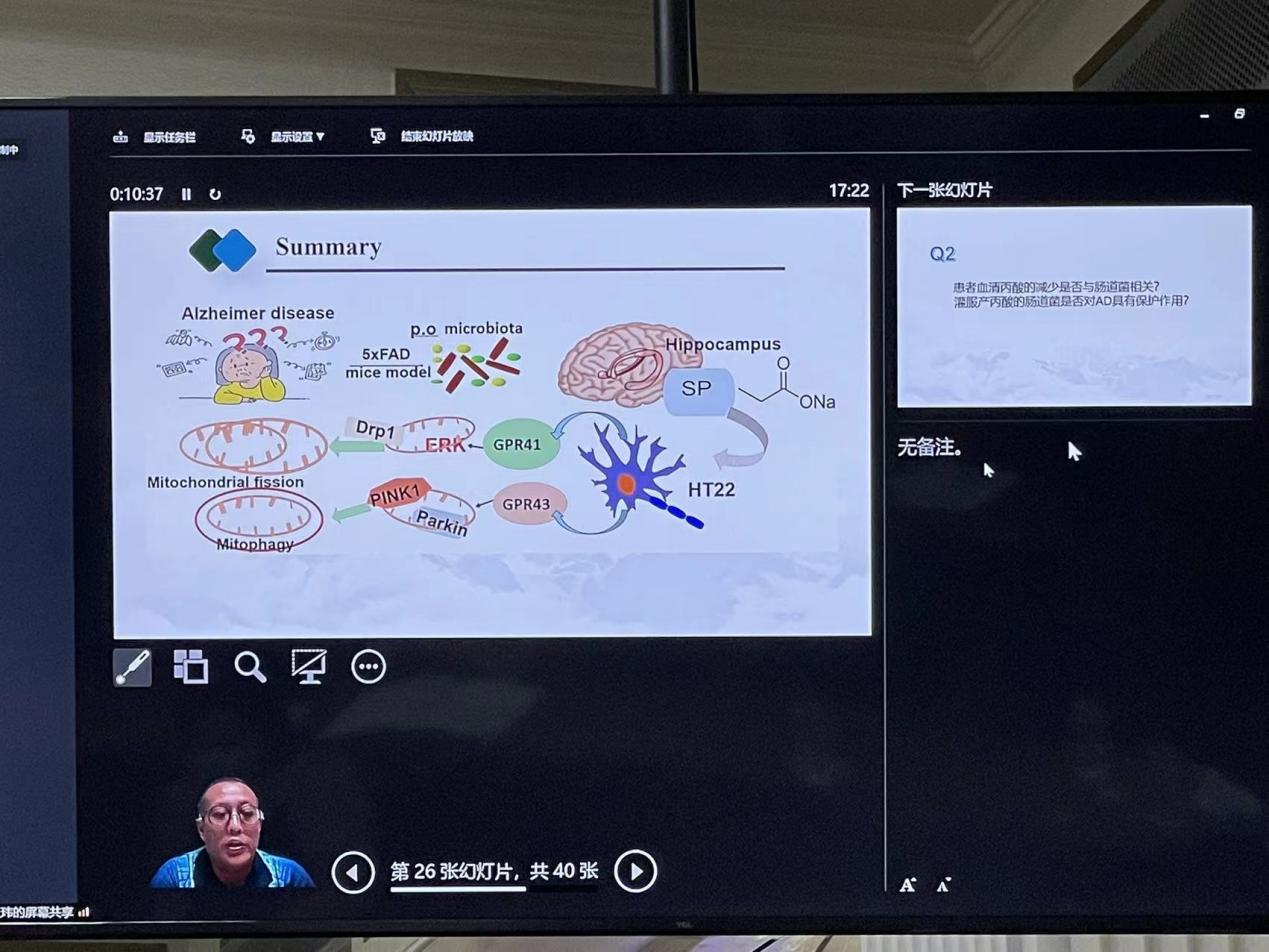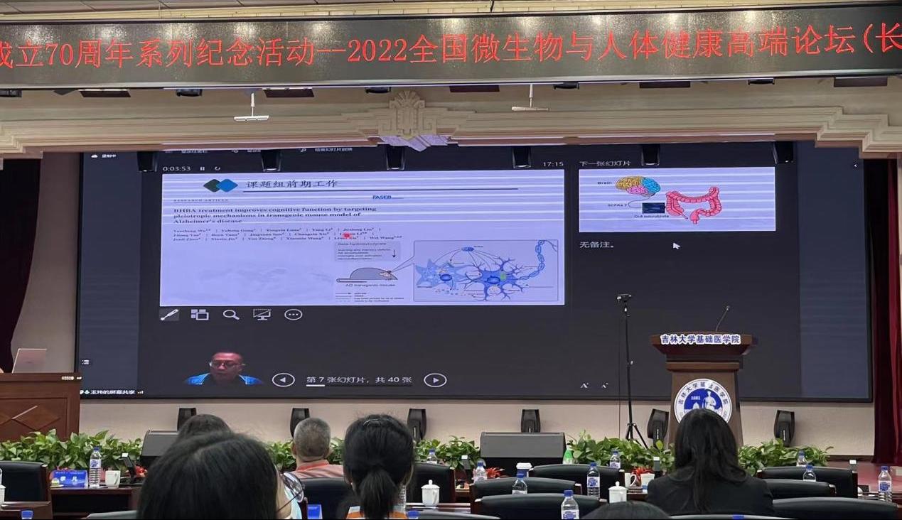 王玮教授以“通过肠道微生物群靶向线粒体功能障碍能否成为阿尔茨海默病干预的新方法?”为题,从AD 患者、AD 小鼠模型和离体神经元细胞三个层面,系统探讨了在短链脂肪酸给药和肠道微生物移植对阿尔茨海默病动物模型的保护作用及作用机制,介绍了公司健康养殖创新研究院营养免疫调控研究团队在微生物与健康领域的研究基础与最新研究成果。本次学术论坛,线上线下凝聚了一批中国生物医学领域的优秀的科学家。专家及参会者们围绕微生物学国内外的最新研究成果进行了充分的交流和探讨。王玮教授参加此次会议并进行大会汇报,充分展示了公司在微生物领域及健康领域的研究特色及研究成果,也反映出公司在微生物基础研究领域的水平。