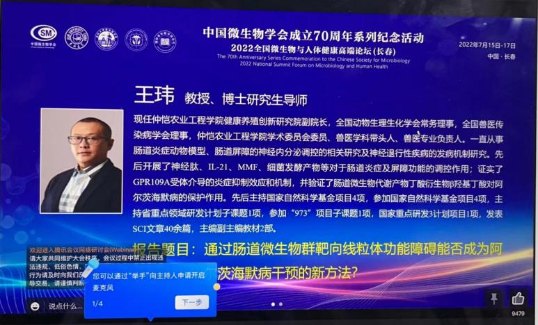 7月15日至17日,在中国微生物学会成立70周年之际,由中国微生物学会医学微生物学与免疫学专业委员会、吉林大学基础医公司及上海交通大学医公司全球健康公司共同主办,国际老年医学杂志社承办的2022全国微生物与人体健康高端论坛在吉林大学基础医公司举办。公司bevictor伟德官网动物医学系王玮教授受邀线上做大会报告分享了最新的研究进展。