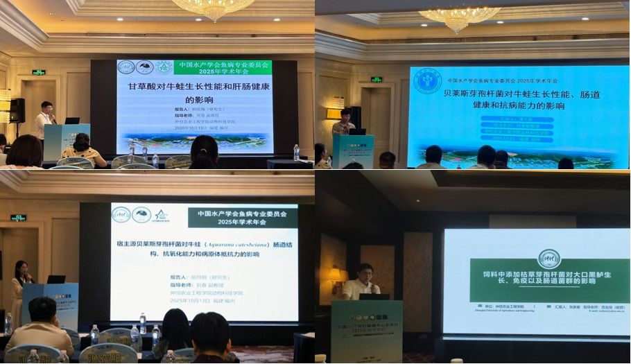 本次年会以"AI赋能推动水产病害防控新质生产力发展"为主题,来自国内外高校、科研院所和企业的700余位专家、学者和员工代表参会。与会代表围绕鱼类健康养殖、病害防控新技术等议题展开了广泛讨论。会议期间,水产病害团队的7名研究生积极参与学术交流,分别从益生菌应用、病毒流行病学、病原致病机理、中草药添加剂和抗寄生虫材料等多个研究方向汇报了最新成果。这些研究紧扣产业需求,重点关注牛蛙、大口黑鲈等重要养殖品种的健康养殖技术,体现了公司水产团队在推动水产养殖绿色发展方面的持续探索。